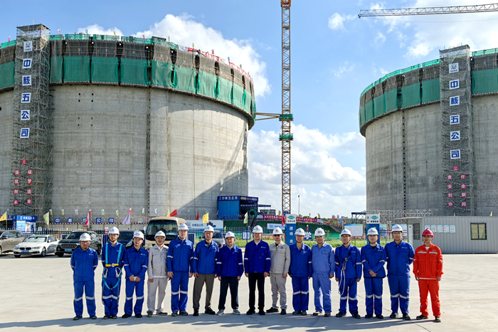 該項目單臺LNG儲罐拱頂重量達463噸,氣壓頂升作業(yè)屬超過一定規(guī)模的危險性較大的分部分項工程,技術難度與風險管控要求極高。集團統(tǒng)籌資源,聯(lián)合中國五環(huán)工程有限公司、中國核工業(yè)第五建設有限公司,通過對氣頂升五大核心系統(tǒng)聯(lián)合檢查驗收和全流程精準調(diào)控,最終實現(xiàn)拱頂安全平穩(wěn)就位,充分體現(xiàn)了集團在大型能源基礎設施建設領域的專業(yè)化管理能力和"造船+"管理體系優(yōu)勢。