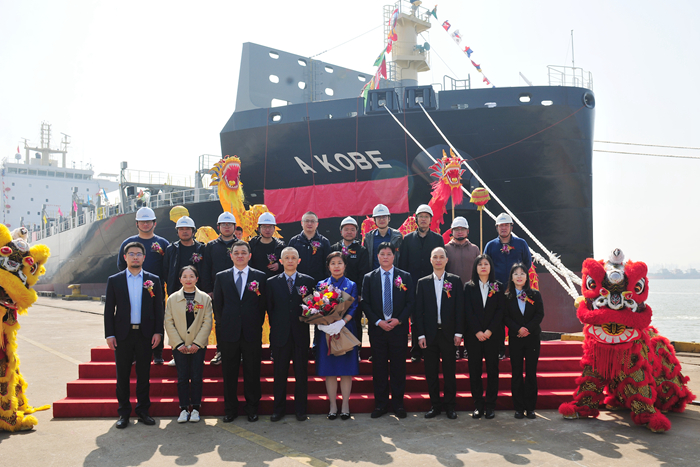 賈軍玲女士將新船命名為“A KOBE”(神戶)輪,并為新船砍纜、擲香檳禮。在“A KOBE”(神戶)輪首任船長的引導(dǎo)帶領(lǐng)下,嘉賓登船參觀新船。新船命名人賈軍玲女士拉響啟航汽笛,她祝福新船乘風(fēng)破浪,通江達(dá)海,開辟遠(yuǎn)航新篇章。祝愿隨船船員永遠(yuǎn)一帆風(fēng)順,為船東和各方帶來繁榮和財富。