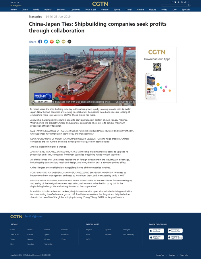 近年來(lái),中國(guó)造船業(yè)迅猛發(fā)展,與日本船企形成了競(jìng)爭(zhēng)。現(xiàn)兩國(guó)正致力于尋求在造船方面合作共贏,兩國(guó)企業(yè)均期望建立更多合資公司。CGTN的鄭亦冰帶來(lái)以下最新報(bào)道。