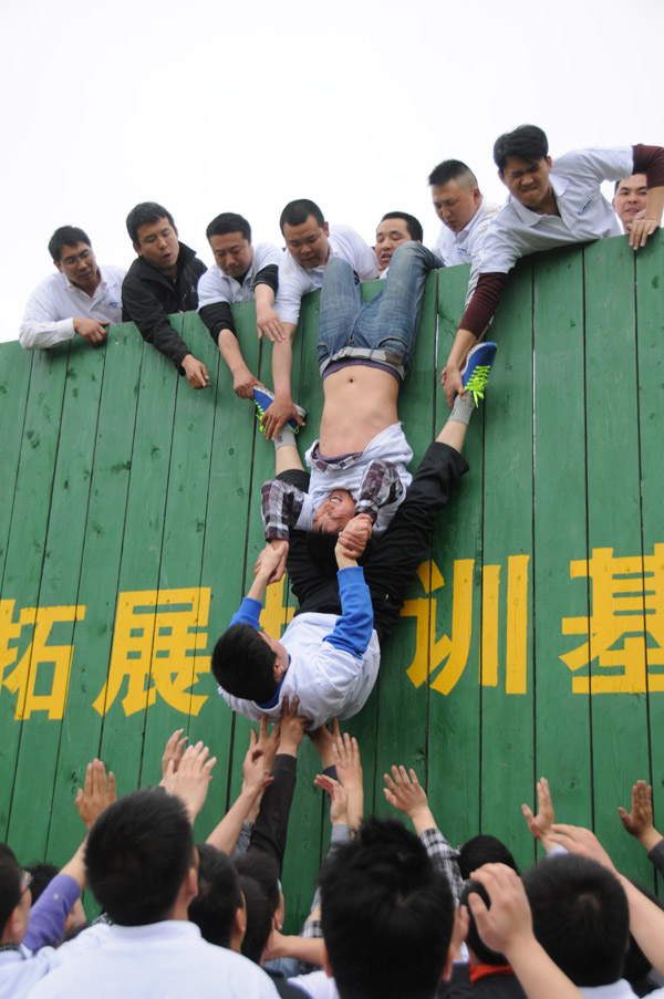 下午的拓展項(xiàng)目更是“體驗(yàn)升級(jí)”,“卓越圈”項(xiàng)目讓人意識(shí)到從優(yōu)秀到卓越不是一蹴而就的,是一個(gè)曲折的過(guò)程,是一個(gè)不斷超越的過(guò)程,在一輪一輪挑戰(zhàn)5.4秒這個(gè)終極時(shí)限的過(guò)程中,我們的年輕干部們磨傷了手、劃傷了臉、蹲酸了腿,任灰塵在身邊沸騰,任汗水在臉上流淌,他們都沒(méi)有退縮一步,不斷的嘗試、改進(jìn)、再?lài)L試、再改進(jìn),最終,5.21秒這個(gè)卓越的成績(jī)被記錄在了成績(jī)冊(cè)上,大家歡呼雀躍。到了最后的挑戰(zhàn)了,“畢業(yè)墻”垂直立于地面,沒(méi)有輔助設(shè)施,沒(méi)有輔助人員,大伙兒覺(jué)得需要1.5小時(shí)這47名學(xué)員才能全部翻過(guò)這面墻——4.2米高的墻。按照教練的指導(dǎo),做基礎(chǔ)的、做輔助的、做保護(hù)的、做拉手的,自發(fā)輪流上陣,伙伴們一個(gè)一個(gè)互相拉扯著翻越了畢業(yè)墻,他們中有人肩膀被踩破了,有的肌肉僵硬了,有的手臂勒紫了,但都沒(méi)有吭一聲,只想著讓所有的伙伴全都快速翻過(guò)墻,堅(jiān)持不懈的精神在他們中不斷傳遞著……終于他們創(chuàng)造了一個(gè)自己都沒(méi)敢想的奇跡,15分49秒51,所有47人全部完成了翻越!