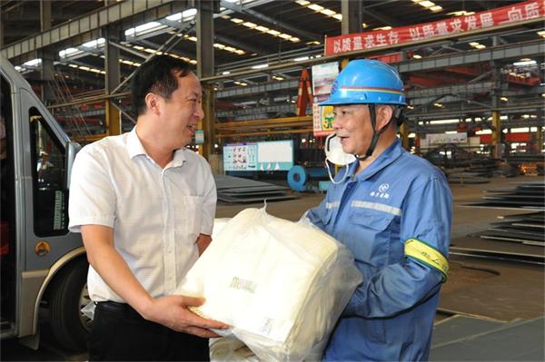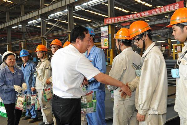 胡榮華副主席帶隊慰問了在高溫下堅守工作崗位的新揚子加工車間員工,給他們送去防暑降溫物品,他代表市委、市政府向頂著烈日奮戰在一線的全體工友表示慰問。之后,市總領導一行還對我集團上半年度工會工作進行了調研。在聽取工會王主席對我司上半年主要的工會工作和職工活動介紹后,胡副主席用“四個有”評價了我們的工作,即“企業發展有條不紊、工會工作井井有條、活動開展有聲有色、服務職工有心有愛”當天,市總共為我們送來了400條毛巾和5箱礦泉水的慰問品。